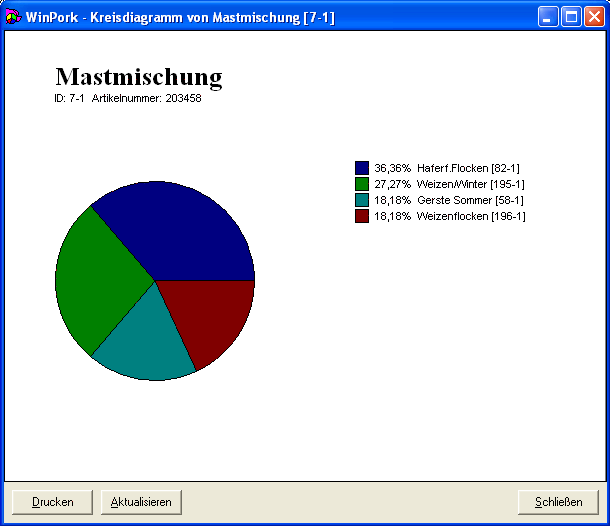 Eine Grafik zeigt oft viel einprägsamer die Zusammensetzung einer Mischung. WinPork erstellt Ihnen von jeder Mischung auch eine Kreisdiagramm.